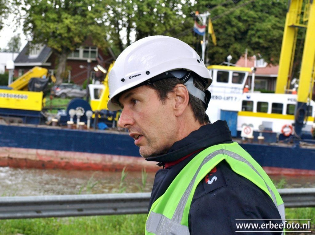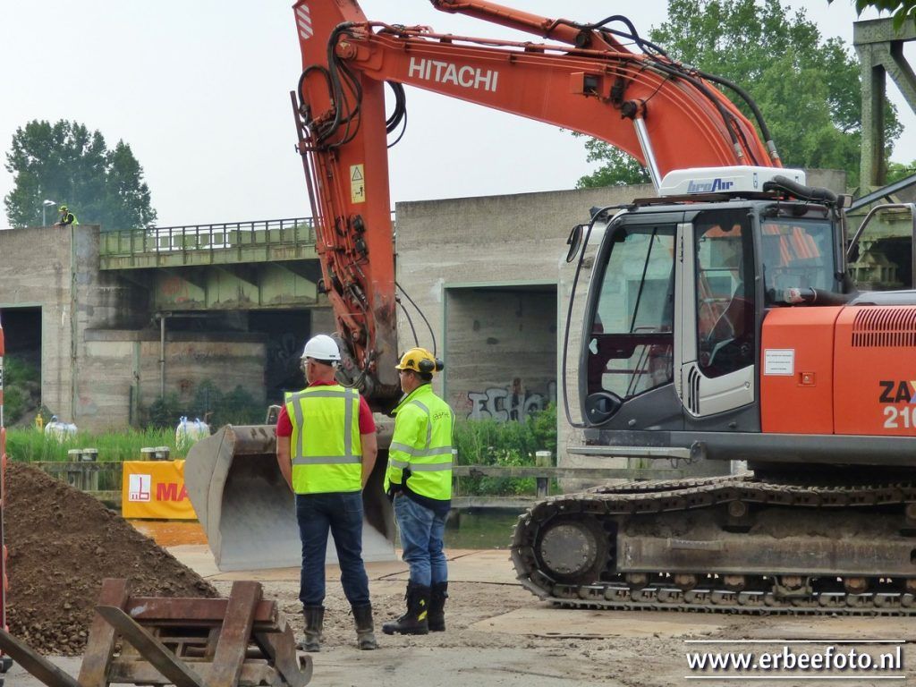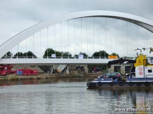 Duidelijk zichtbaar hoe de brug nu snel klaar zal zijn als je de eerdere foto’s vergelijkt. Zelfs in de weekenden wordt doorgewerkt door de bouwvakkers. Het pontje vaart nog steeds druk heen en weer, want ook van de klapbrug is niets meer over.